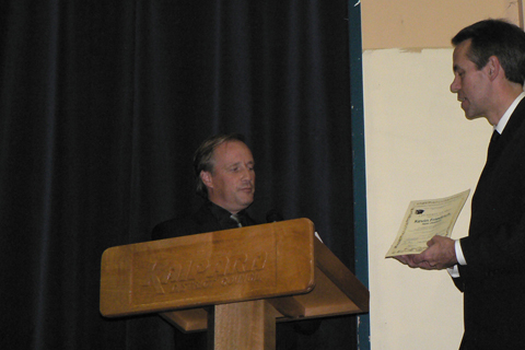 Kevin Friedrich receiving the CIA Merit Award in recognition for his outstanding contributions to the International Accordion Movement from new CIA President Raymond Bodell (UK). |