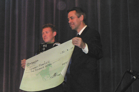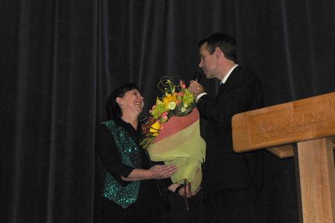Kevin Friedrich presenting concert organizer Heidi Dreyer with flowers in appreciation for her tremendous work in organizing the concert and fundraising the $10,000 in cash prizes on behalf of the Dargaville Community |
