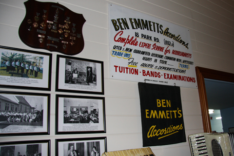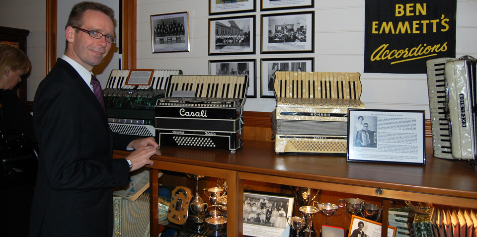 Kimmo Mattila viewing the display pertaining to Ben and Doreen Emmett, Kevin's original accordion teachers in Dargaville |