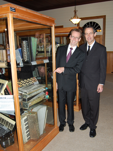 Kevin Friedrich and His Worship the Mayor of Dargaville Neil Tiller and some of the instruments at the Accordion Gems display |