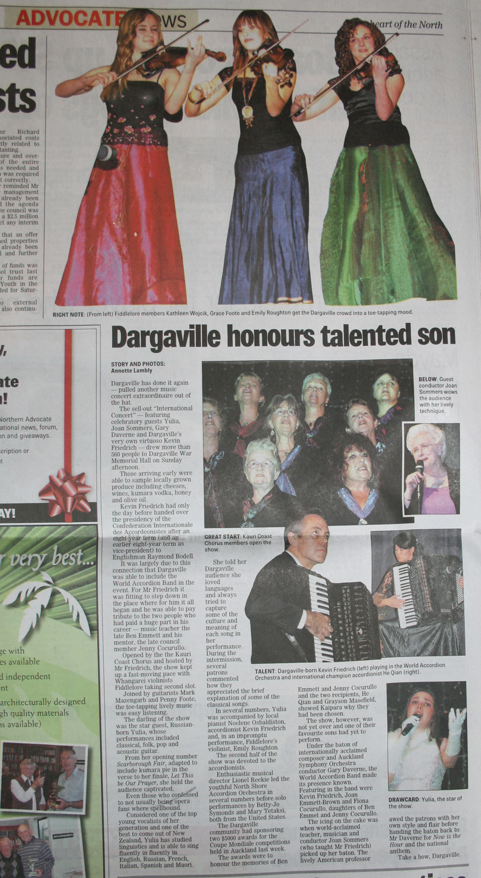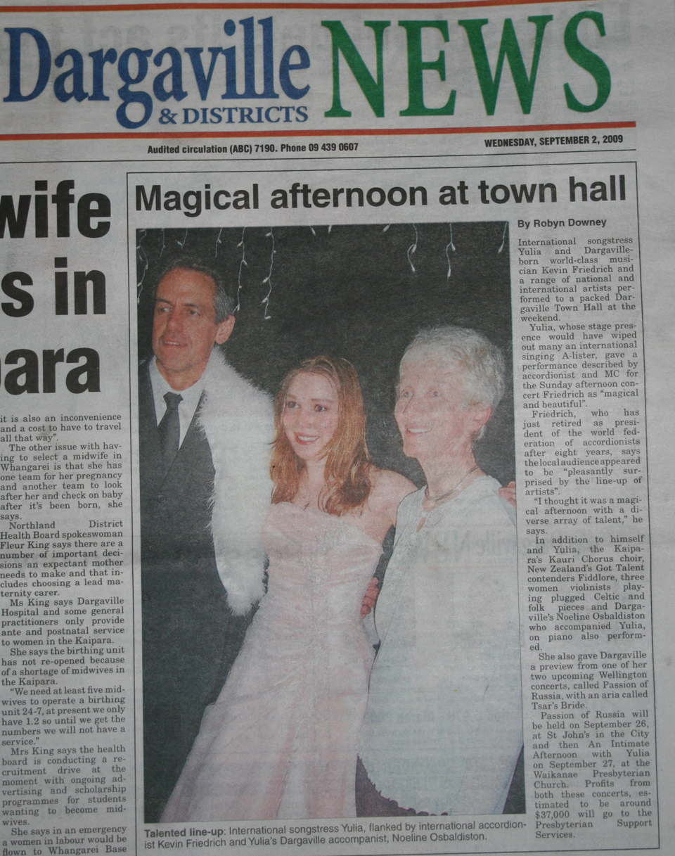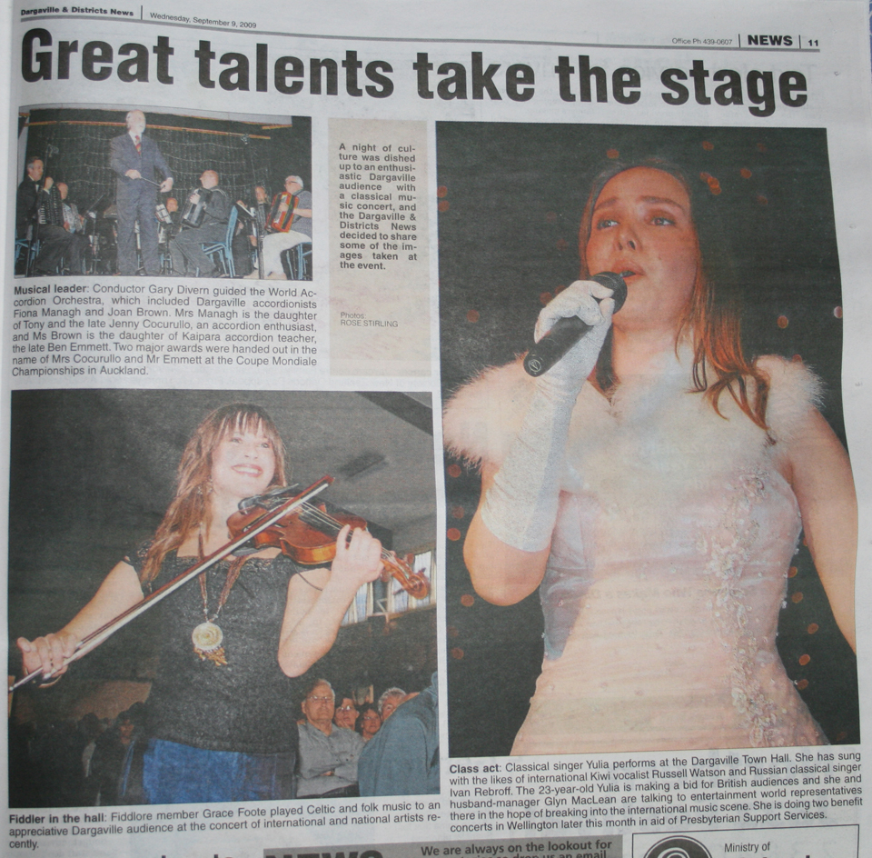 Following the Concert in the Dargaville Town Hall the 'Dargaville and Districts News' and 'The Northern Advocate' Newspapers covering the entire northern region of New Zealand featured very positive reviews and pictures of the concert. |