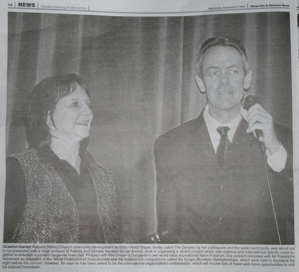 | The Dargaville Community put on an International Celebration of Music hosted by Kevin Friedrich as a finale to his eight years of office as President of the Confederation Internationale des Accordeonistes (CIA). |