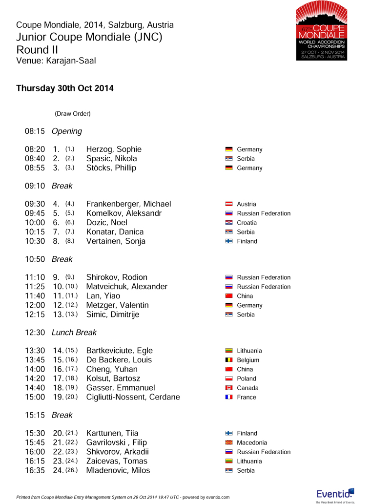 The thirteen contestants that qualified for the second round of competition were required to present one complete original work for the accordion. Videos of the performances are located in the Video Center. |