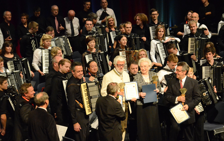 | The Gala Prize Giving Concert concluded the 67th Coupe Mondiale festival. Trophies and Cash prizes were awarded to the top three winners from each category. In addition to the competition prizes, several awards for services to the accordion were presented. The concert featured performances by the youth accordion orchestra MUSIKUM-Orchestra Salzburg, the winners from each of the competitions, concluding with the magnificent World Accordion Orchestra VIII. |