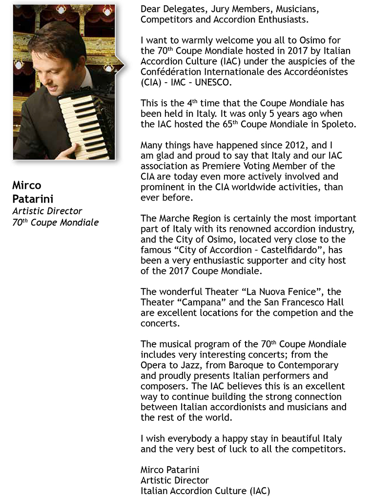 70th Coupe Home Page Schedule of Events Welcome to Osimo, Italy CIA Website