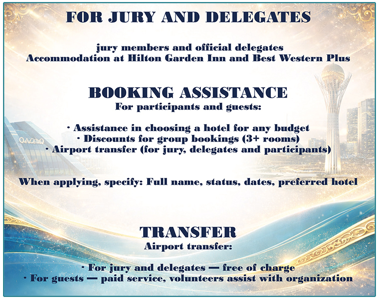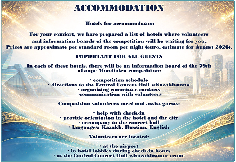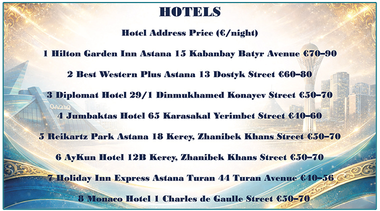 The Hotel accommodation information options for visitors to the 79th Coupe Mondiale in Astana is detailed below, offering a variety of choices depending on the needs of the attendees.